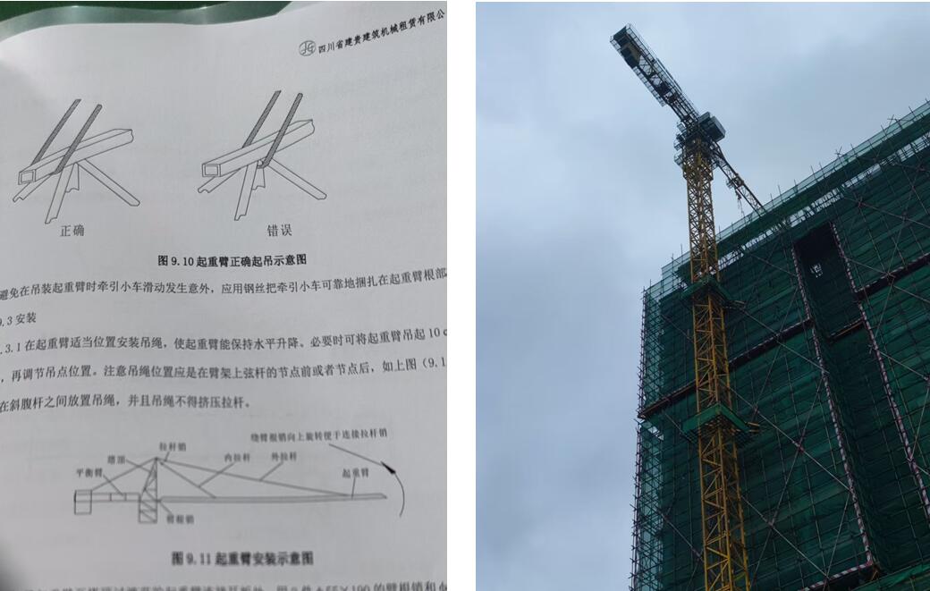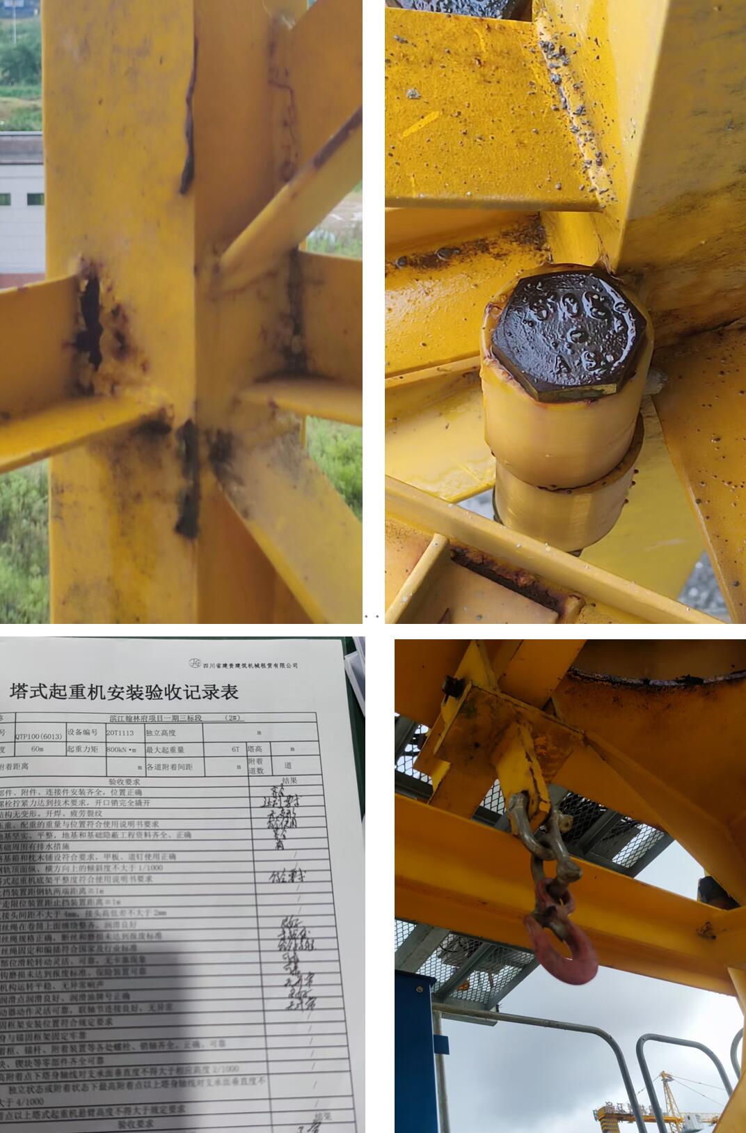 5.塔机个别标节结构锈蚀,连接套不同心;油缸伸出未保护;加节小钩保险扣损坏,验收表吨位、垂直度、绝缘电阻填写与实际不符。
