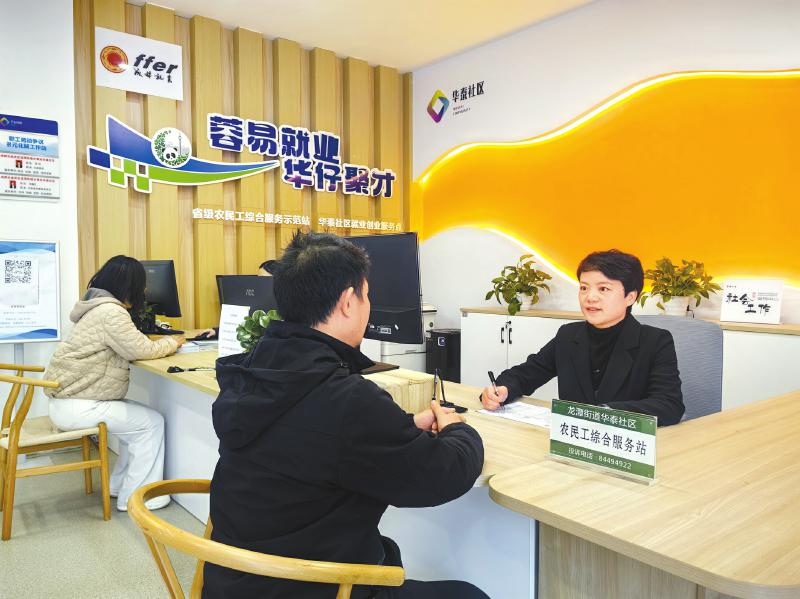成都市成华区龙潭街道华泰社区就业创业服务点,工作人员正接受居民就业咨询。