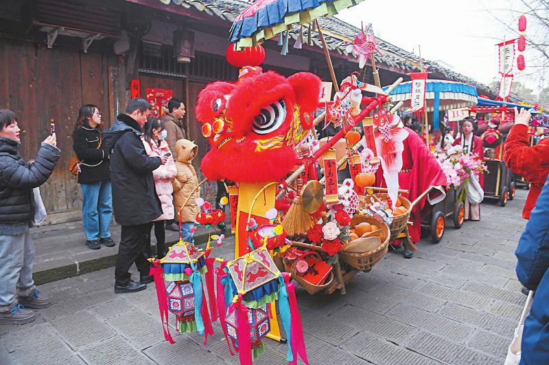 1月21日,锦绣四川非遗赶大集活动在阆中古城举行。图为非遗货郎队伍在古城街道巡游。 王玉贵 摄(C视觉)