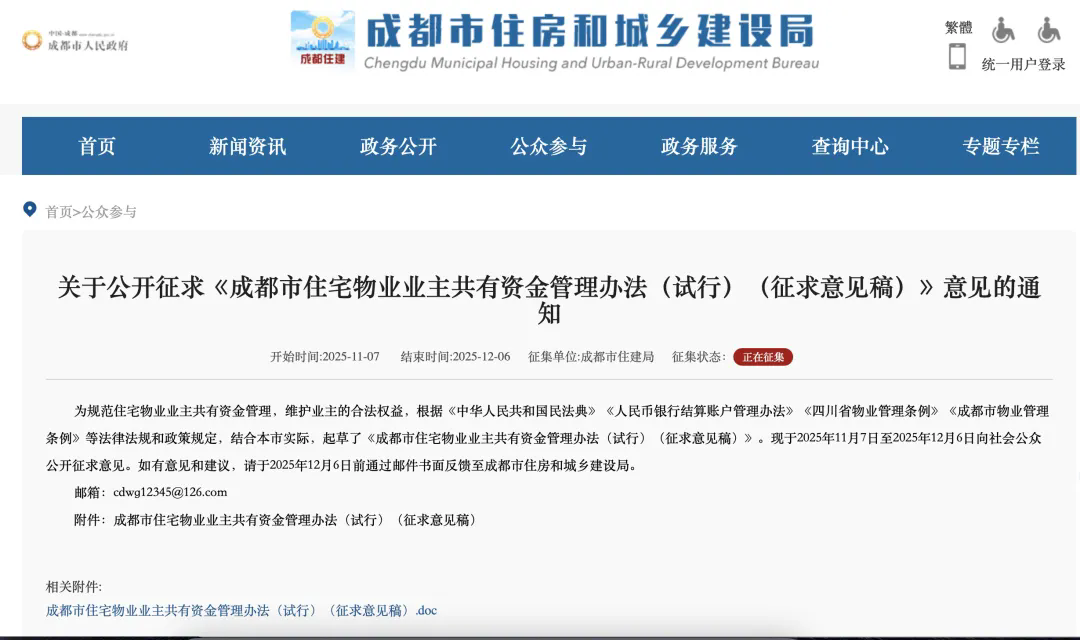 近日,成都市住建局发布《成都市住宅物业业主共有资金管理办法(试行)(征求意见稿)》(以下简称《管理办法(征求意见稿)》),对共有资金来源、专户管理存入和使用等作出明确,并向社会公开征求意见。