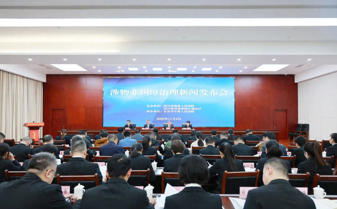 11月6日,四川省高级人民法院、四川省住房和城乡建设厅在自贡市中级人民法院召开新闻发布会,共同向社会发布《涉物业纠纷治理白皮书(2024-2025年度)》,通报2024-2025年度纠纷涉诉情况,介绍纠纷治理亮点举措,并发布四川法院涉物业纠纷典型案例(第二批)以及涉物业纠纷治理典型事例。