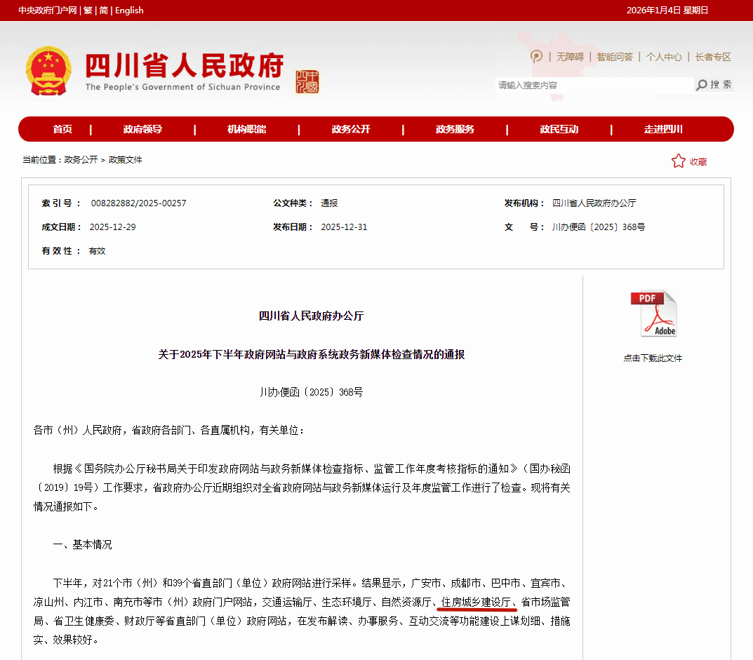 近日,四川省人民政府办公厅发布关于2025年下半年政府网站与政务系统政务新媒体检查情况的通报住房城乡建设厅。
