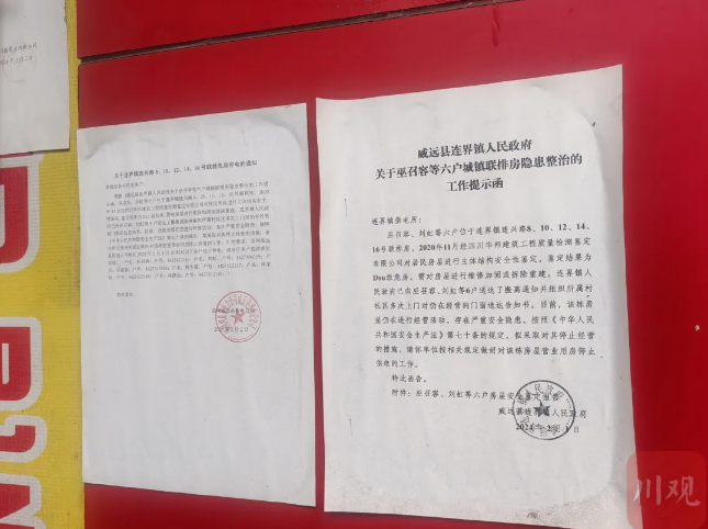 走近看,门面房墙壁贴着几张“提示函”,落款时间为2024年2月,警示这排房屋属于危房,存在严重安全隐患,将采取停止经营等措施。