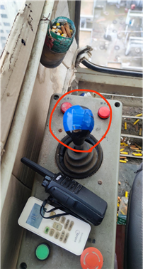 9.上下塔机通道搭设不规范。驾驶室前玻璃缺失,无操作规程,无灭火器。