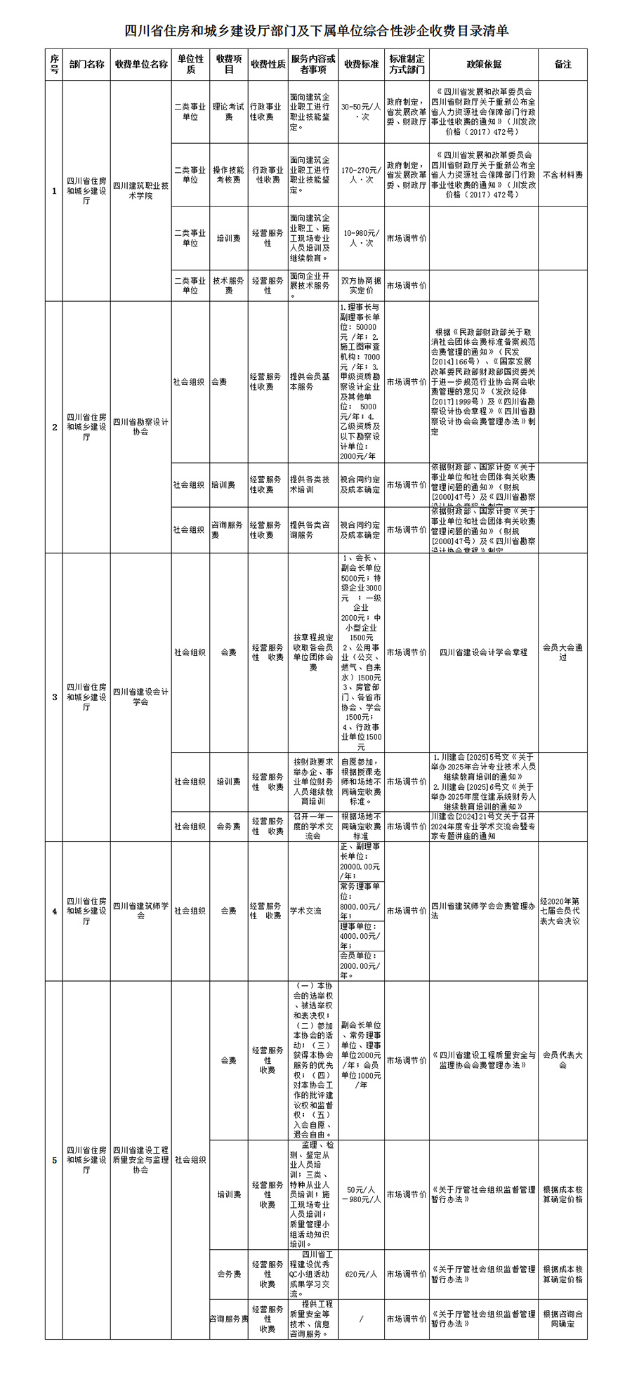 四川省住房和城乡建设厅部门及下属单位综合性涉企收费目录清单