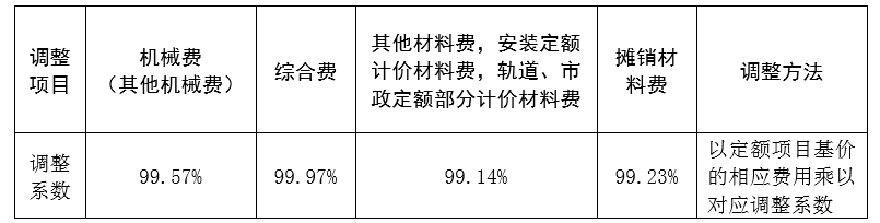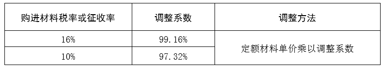 附件第四条调整办法,第(一)条15定额调整,第6款中税金:“销项增值税按税率11%计算,销项税额=税前工程造价×销项增值税税率11%”调整为“销项增值税按税率10%计算,销项税额=税前工程造价×销项增值税税率10%”。