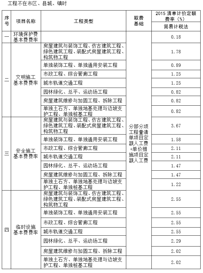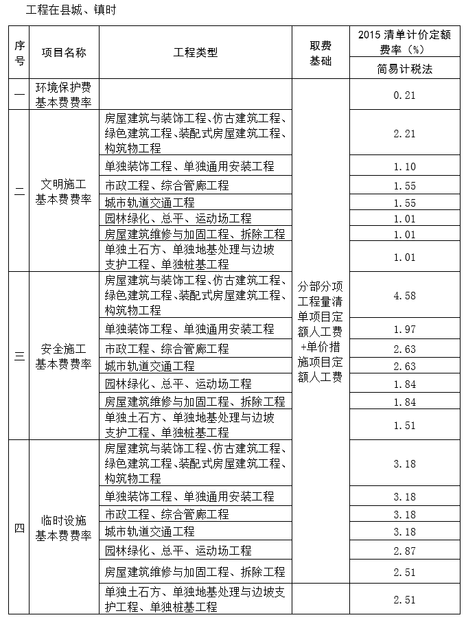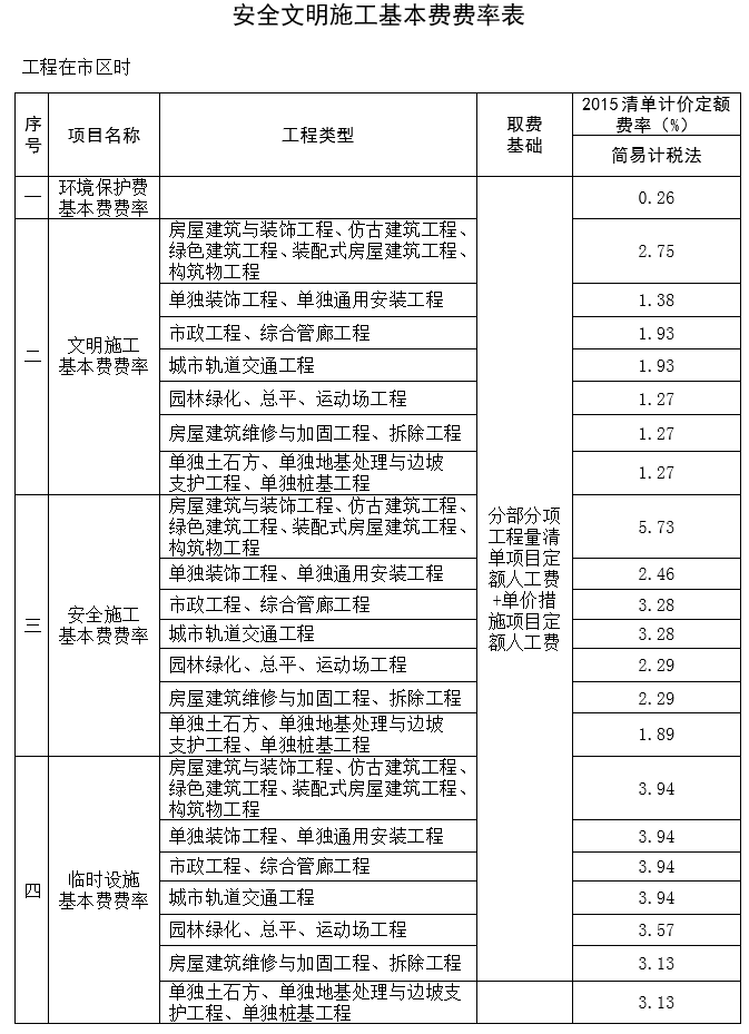 四川省住房和城乡建设厅《关于印发<四川省建设工程安全文明施工费计价管理办法>的通知》(川建发〔2017〕5号)中安全文明施工基本费费率表(简易计税法)调整后的标准如下: