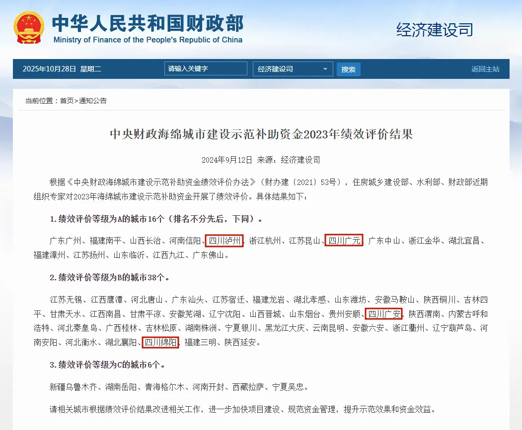 泸州市、广元市获中央财政海绵城市建设示范补助资金2023年绩效评价A级