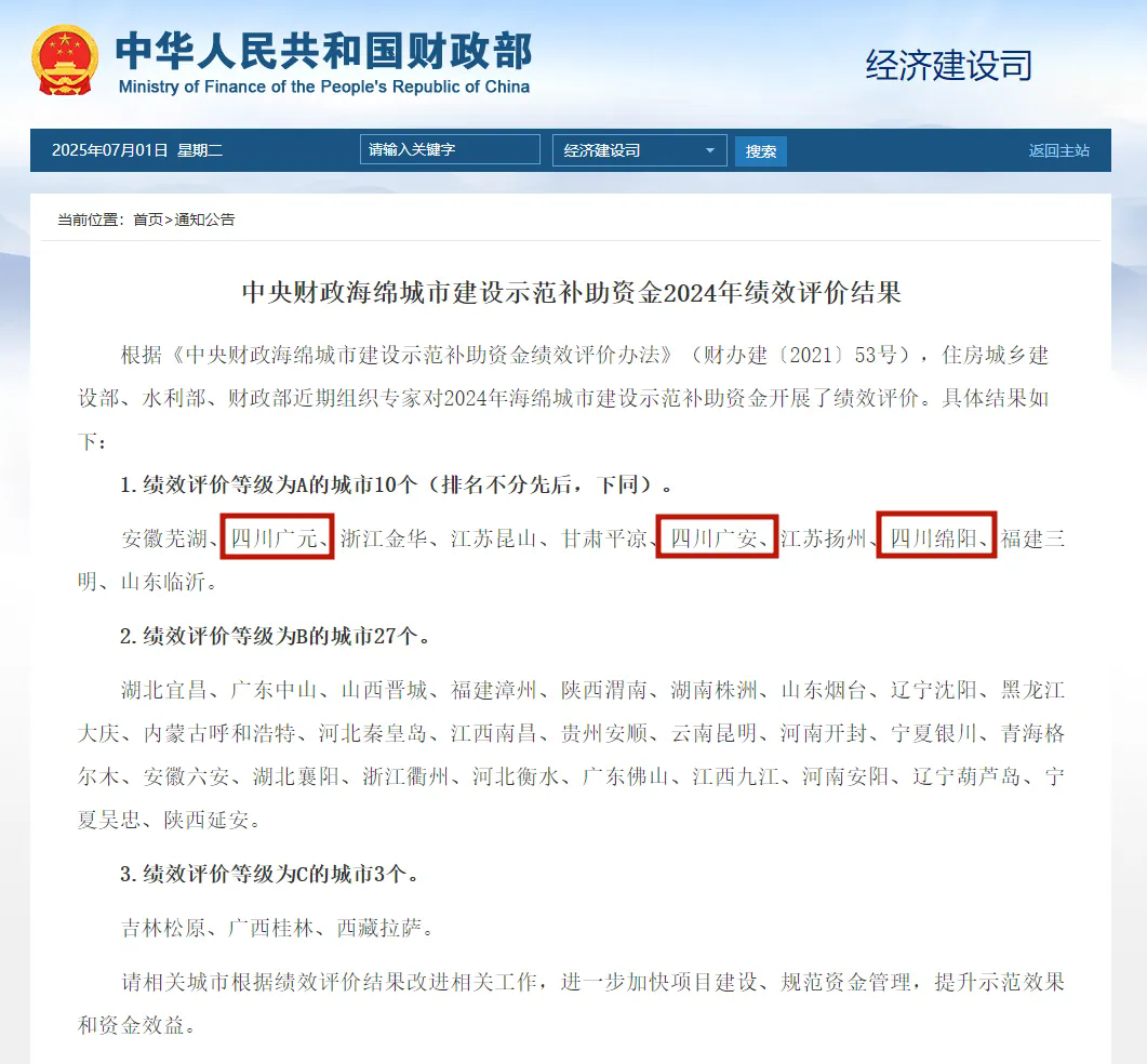 广元市、广安市、绵阳市获中央财政海绵城市建设示范补助资金2024年绩效评价A级