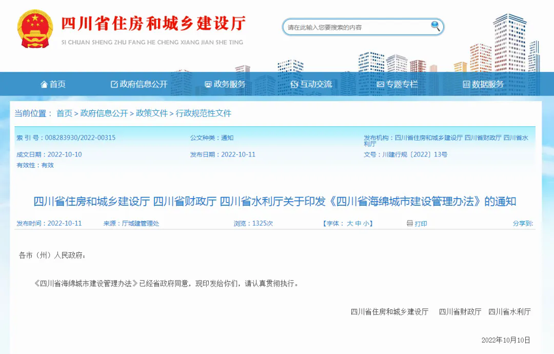 省级层面印发《四川省海绵城市建设管理办法》《四川省海绵城市专项规划编制导则(试行)》等文件。德阳、泸州、广元、广安、内江等城市也探索出台地方性海绵城市建设管理条例及配套技术导则。